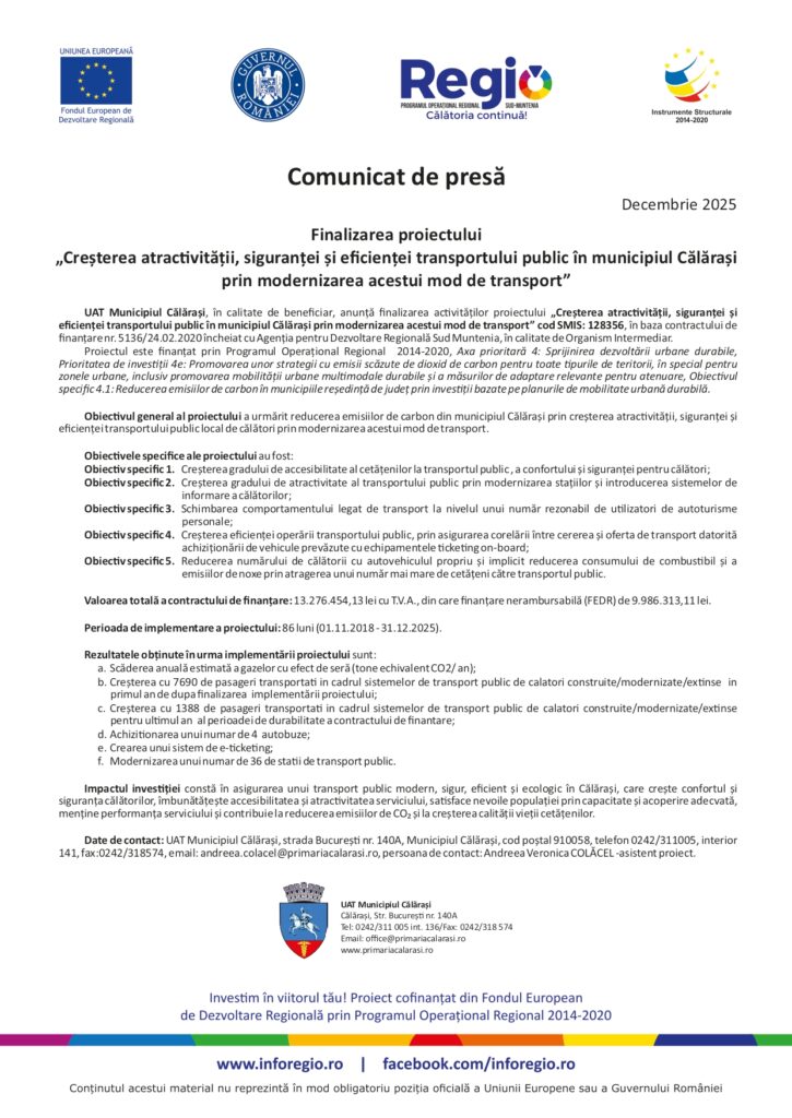 Finalizarea proiectului „Creșterea atracvității, siguranței și eficienței transportului public în municipiul Călărași prin modernizarea acestui mod de transport”