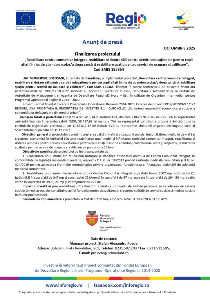 Reabilitare centru comunitar integrat, reabilitare și dotare săli pentru servicii educaționale pentru copii aflați în risc de abandon școlar/a doua șansă și reabilitare spațiu pentru servicii de ocupare și calificare