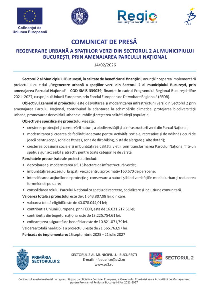 Regenerare urbană a spațiilor verzi din Sectorul 2 al municipiului București, prin amenajarea Parcului Național Posted on February 15, 2026 by admin
